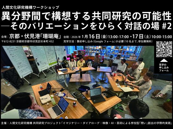 人間文化研究機構ワークショップ「異分野間で構想する共同研究の可能性—そのバリエーションをひらく対話の場 #2」 研異なる専門が出会うとき、どんな「問い」が生まれるのでしょうか。第1回(東京)に続き、第2回「イマジナリー・ダイアローグ」を京都で開催します(2日間)。…